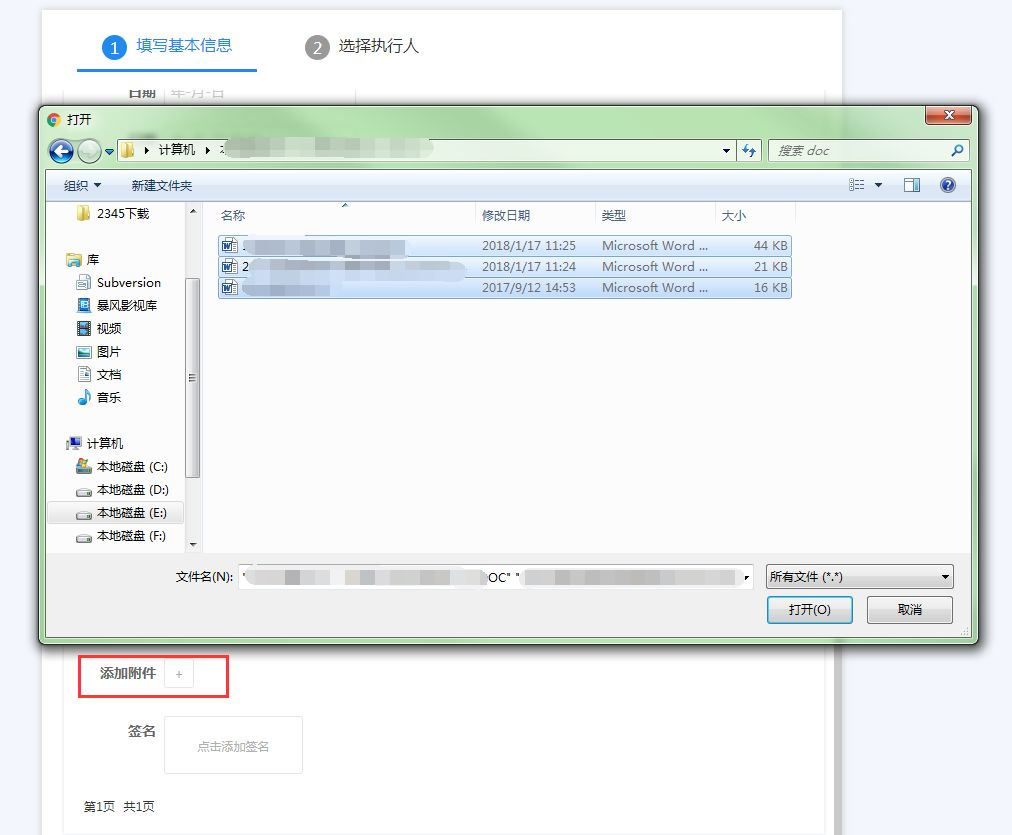 3、表单附件控件从本地上传附件,支持选择多个文件一次性提交上传。