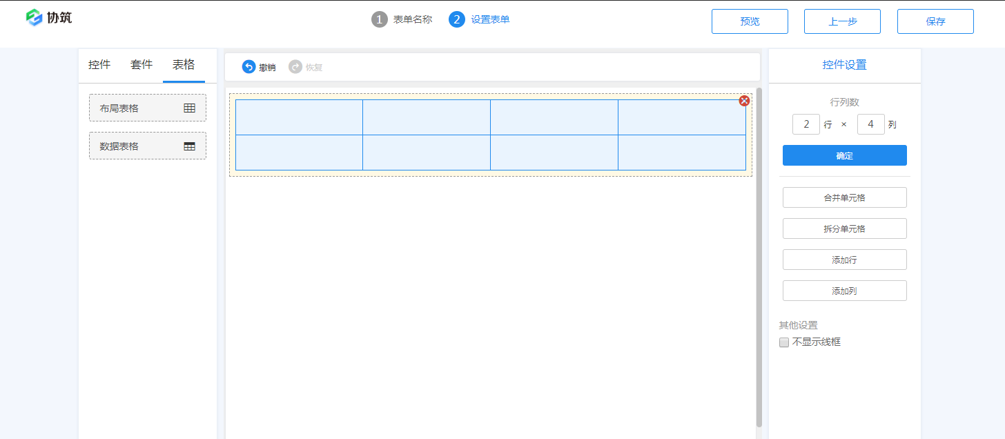 点击左侧栏【表格】,拖入【布局表格】,设置行列数为【2行 x 4列】,点击确定。