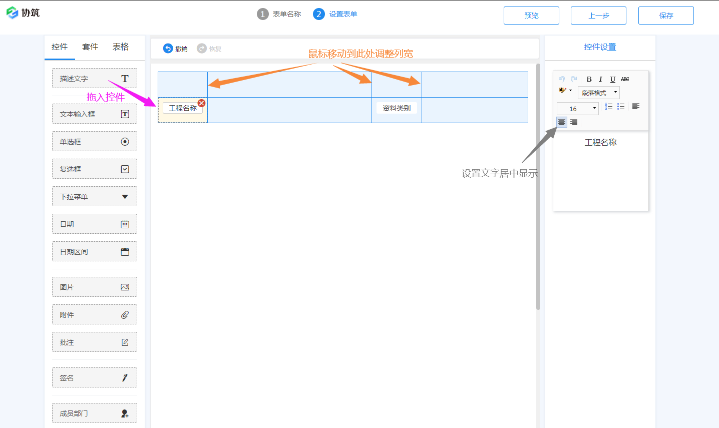 点击左侧栏【控件】,将【描述文字】控件分别拖入第二行第一个和第三个单元格中,输入所需文字,设置居中显示,鼠标移动到第一行的对应位置,调整单元格的列宽,第二行剩下的两个单元格分别拖入【文本描述框】。