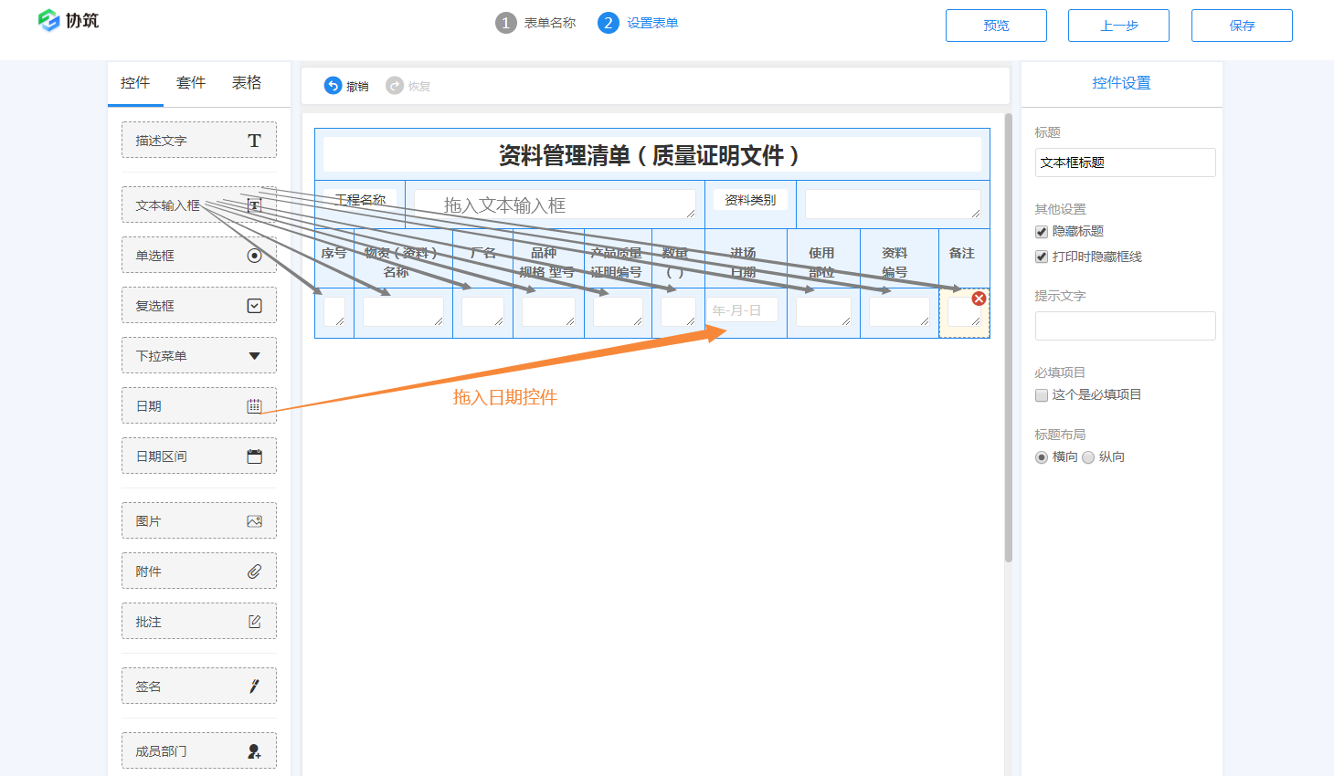 进场日期列下方单元格拖入【日期】,其他列下方拖入【文本输入框】。