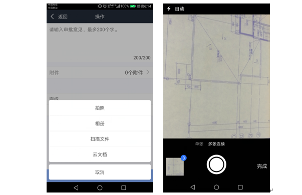 11. 新增添加流程附件可直接通过协筑移动端扫描图纸、文件生成任务PDF,适用于创建流程时,把需要审核人电子签名的纸质文件扫描上传作为附件,无需再通过扫描仪,后续PDF扫描功能也会同步到上传文件。